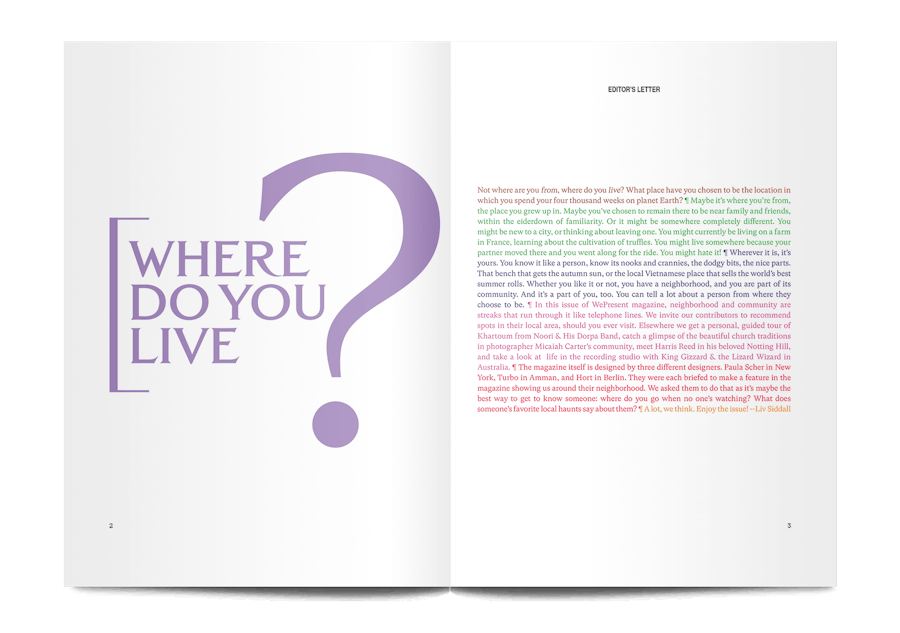 A crazy experiment in the power of graphic design, each issue of WePresent is created in three separate versions by three different sets of designers. The designers for this fifth issue are Paula Scher in New York, Turbo in Amman, and Hort in Berlin, and this product page is for the version designed by Paula Scher.