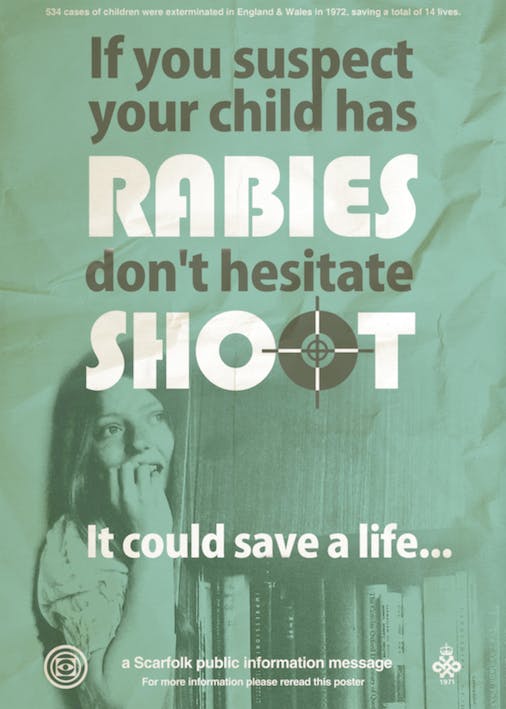 “Richard Littler is a graphic artist and the creator of a dystopian fictional British town called Scarfolk that’s perpetually stuck in the 1970s — it’s a comic satire of the period, but its messages merge into the present day, too. Richard has a blog that’s the imaginary website for Scarfolk Council where he posts mock public information posters like this one that instructs you to do away with your children if you think they might have rabies. Richard’s designs are a perfect pastiche of British public office graphics from the 1970s, so much so that this poster was accidentally published in the UK government’s Civil Service Quarterly in an article about the history of government communications — the Cabinet Office had to issue a statement to admit their mistake.”