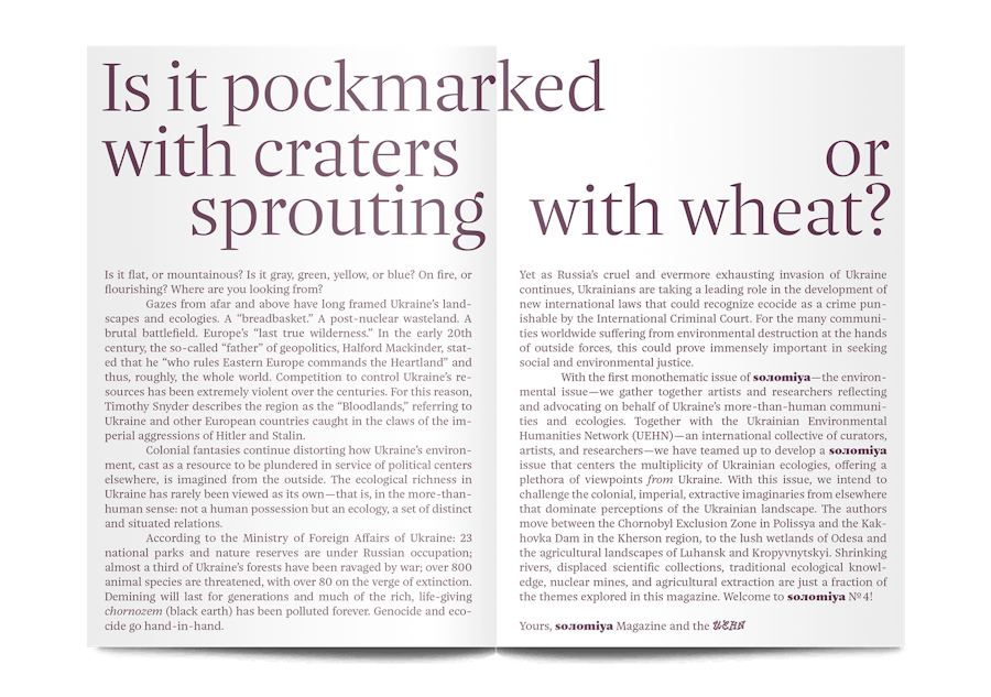 Launched in 2022 in the wake of Russia’s full-scale invasion, Solomiya provides a platform for Ukrainian artists, creatives and activists to reflect on the world around them, as they see it. This fourth issue is smaller and more concentrated than the first three, focusing closely on the intersection of war and the environment, illuminating some of the struggles and contradictions that are central to contemporary Ukrainian life.