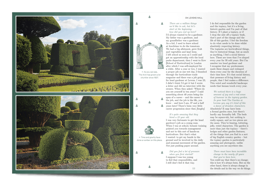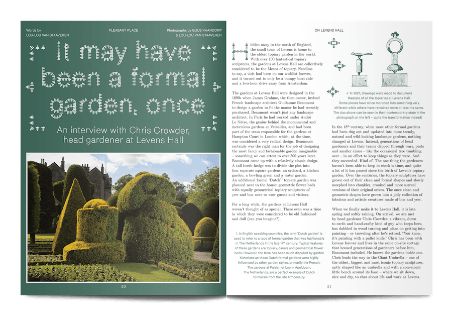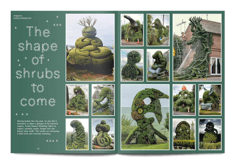 A small and beautiful magazine from Amsterdam, Pleasant Place considers the art of gardening. This sixth issue is themed ‘Topiary’, and it digs into the history of cutting trees and hedges into strange shapes, as well as the most recent developments in this human compulsion, “To force the unruly natural world into submission, as if we were tiny gods on earth.”