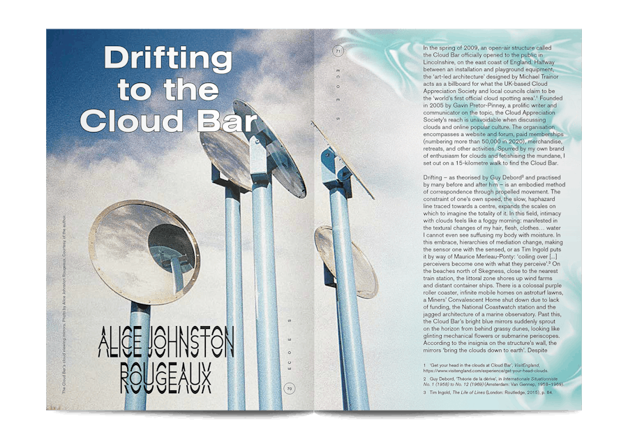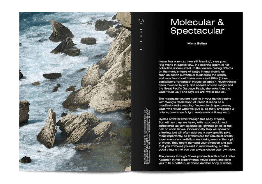 Published by Sonic Acts, an interdisciplinary arts organisation based in Amsterdam, Ecoes shifts readers away from the anthropocentric norm and shows the non-human as more than just a resource to be exploited. This issue focuses on water, and its stories take turns to problematise the stuff that comes out of our taps, encouraging readers to slow down and think again about something that most of us probably take for granted.